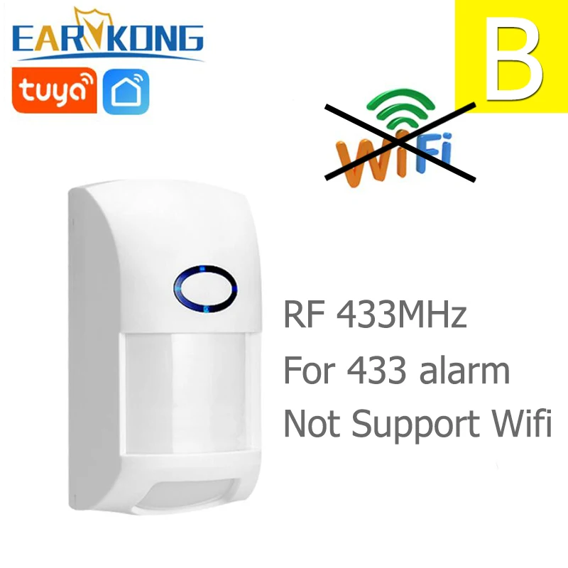 Option B is RF 433MHz version, it does not support wifi app function. Please read it careful when you buy it. The 433MHz version infrared detector is compatible to the 433MHz home burglar alarm system in our store.