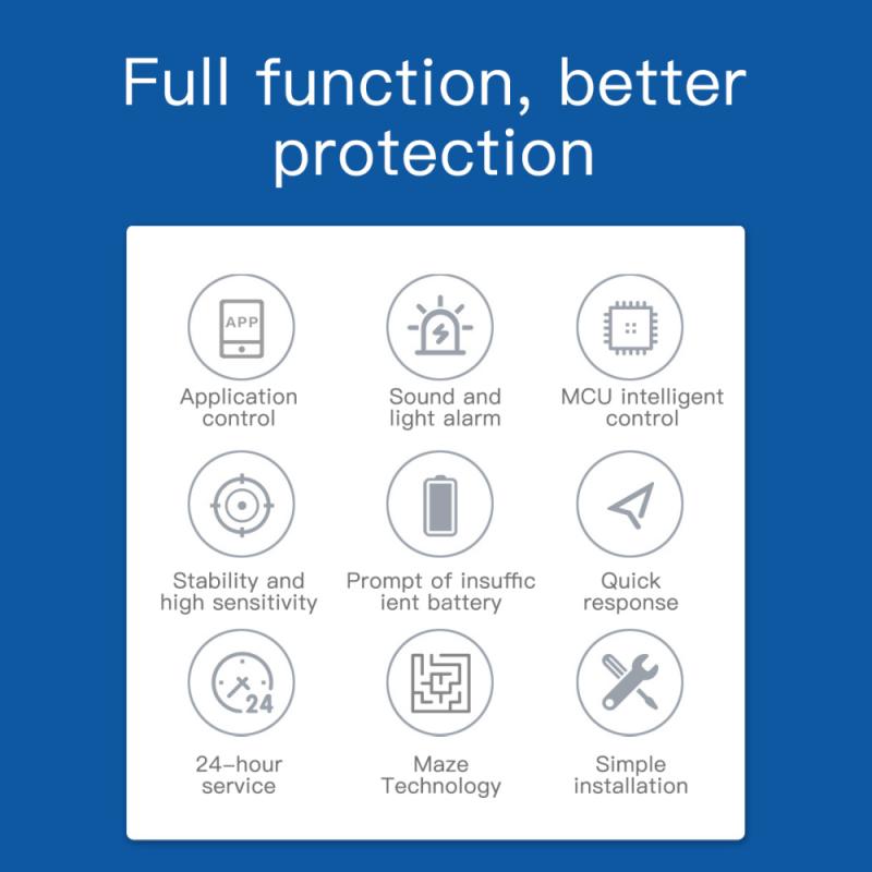 Test: In normal state, long press the “test” button for 2s to trigger the sound and light alarm, the alarm message is sent to the mobile APP.