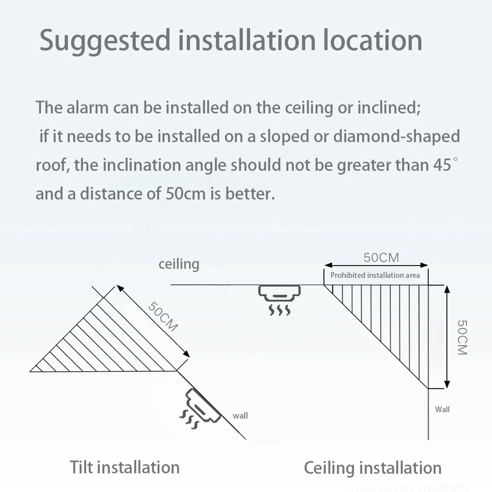 Installation Suggestions: The alarm can be hoisted or tilted, it needs to install the roof with a slope or a rhombus. The inclination angle should not be greater than 45°and a distance of 50cm is better.